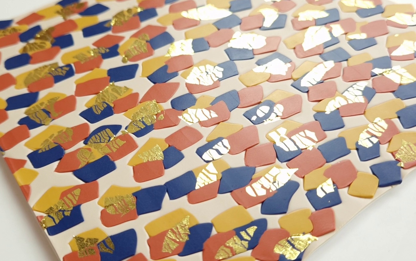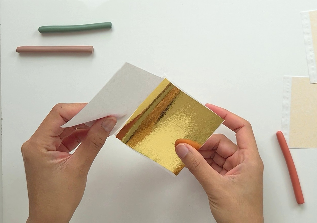 Translucide + poudre de mica = effet nacré. Une alliance subtile avec un montage en millefeuille pour former un motif rayé élégant avec feuille d'or et peinture.